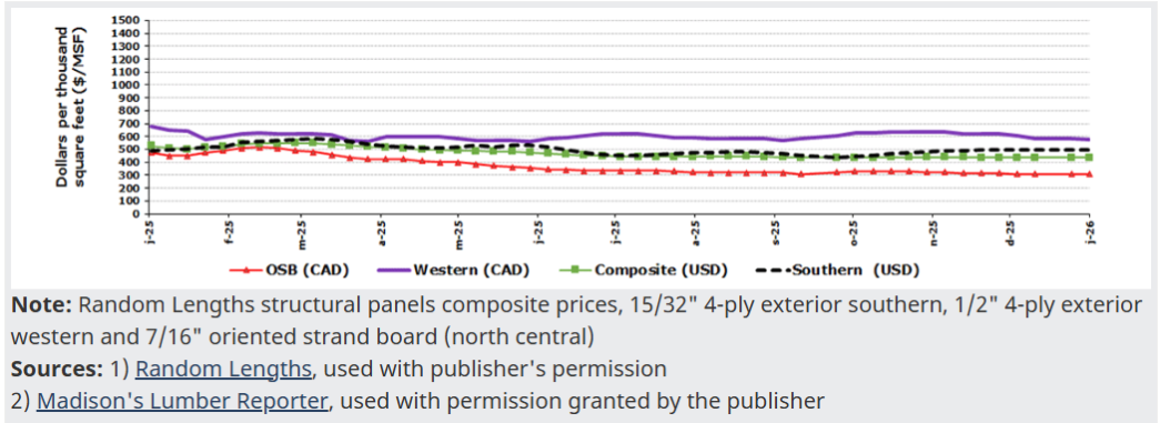 Given that many homes in Canada use lumber and wood products, the price of lumber is a key factor in construction costs. Below, CHBA tracks weekly lumber and panel prices, and lumber futures.